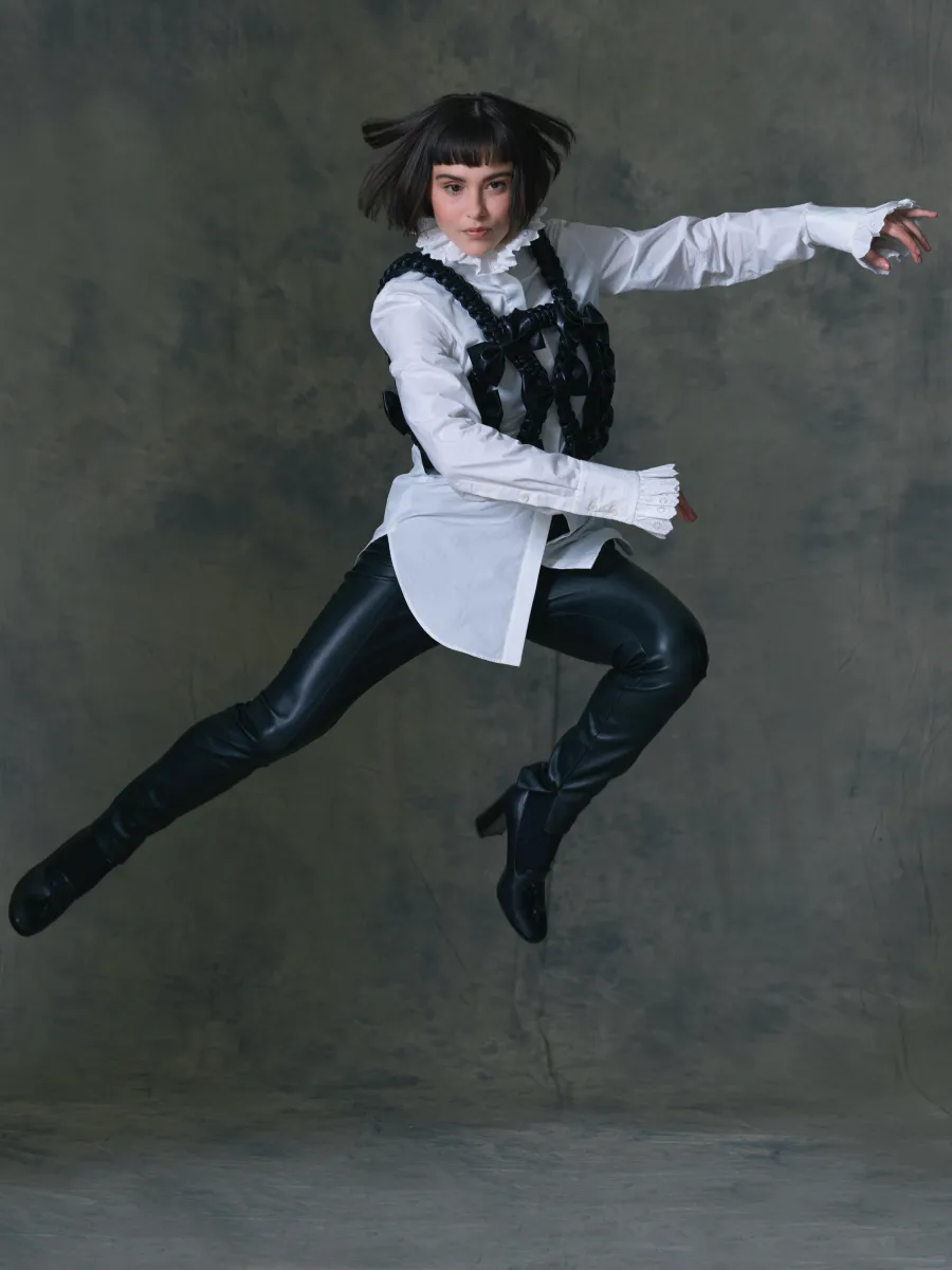 Kelsey Wears: Shirt: Paco Rabanne Leather Vest: Comme Des Garcon