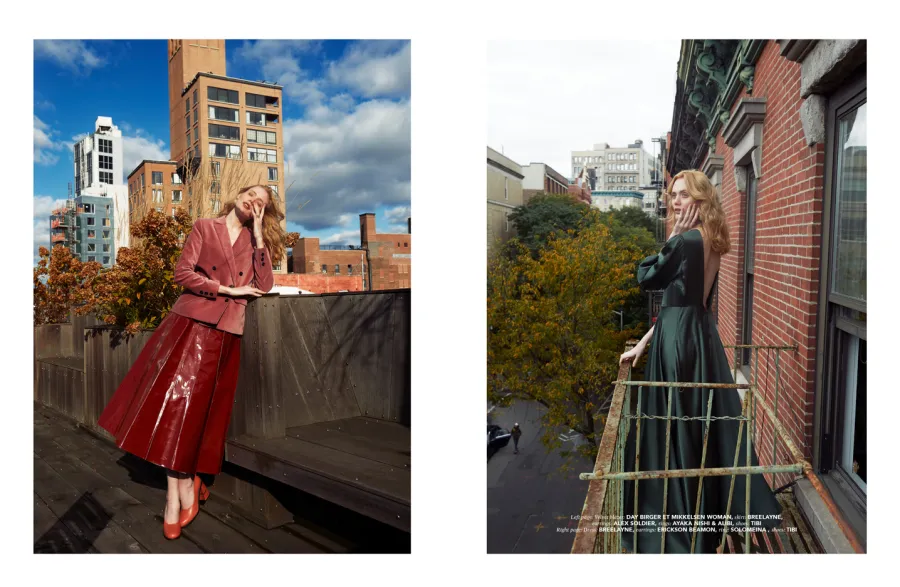 Right page: Dress:BREELAYNE, earrings: Erickson Beamon, ring: Solomeina , shoes: Tibi