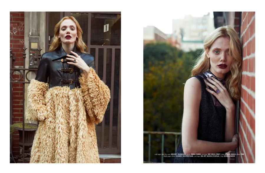 Left page: faux fur coat: Kelsey Randall, pants: Nika Tang, earrings: We Who Prey, ring: Ayaka Nishi, shoes: Tibi