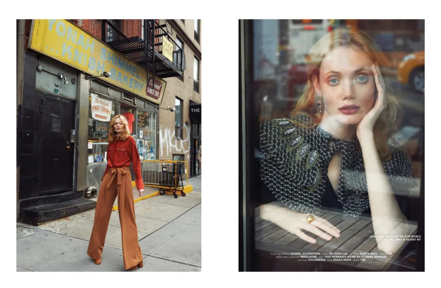 Left page: blouse: Daniel Silverstain , pants: Mi Jong Lee, earrings: Ayaka Nishi , shoes: Tibi