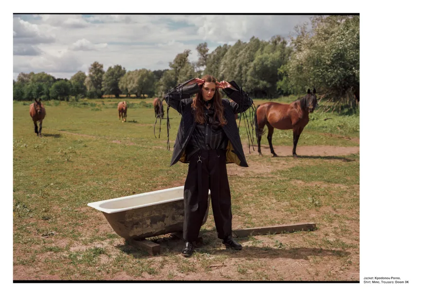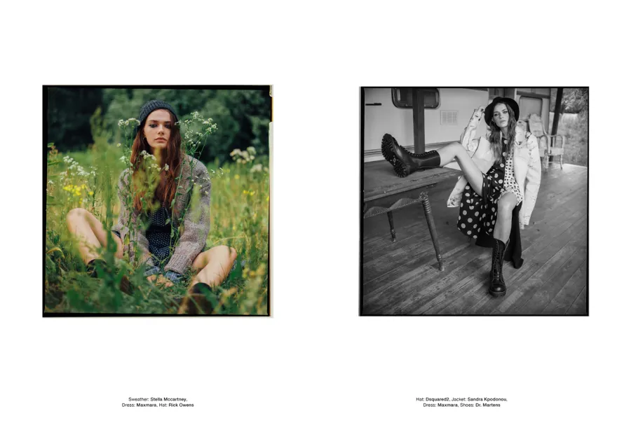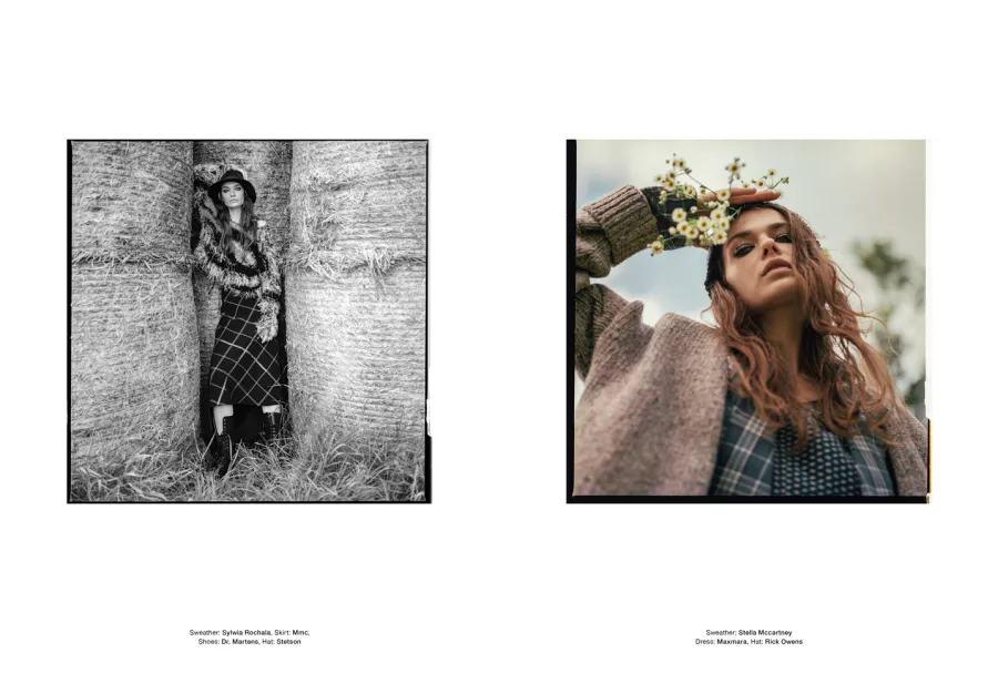 Left page: Sweater: Sylwia Rochala, Skirt: Mmc, Shoes: Dr. Martens, Hat: Stetson