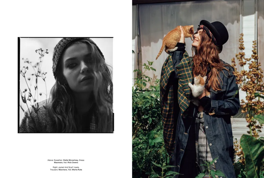 Right page: Sweater: Stella Mccartney Dress: Maxmara, Hat: Rick Owens