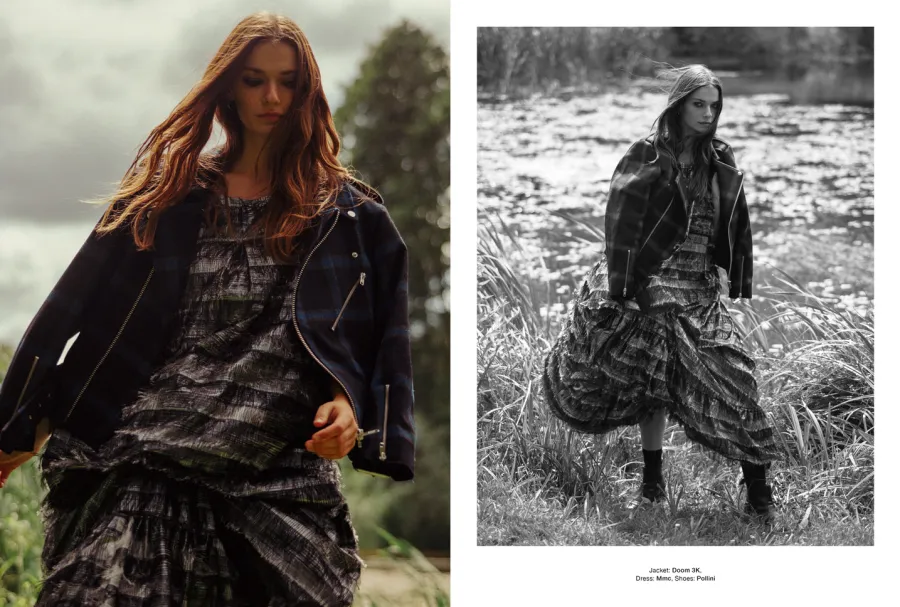 Right page: Hat: Dsquared2, Jacket: Sandra Kpodonou, Dress: Maxmara, Shoes: Dr. Martens
