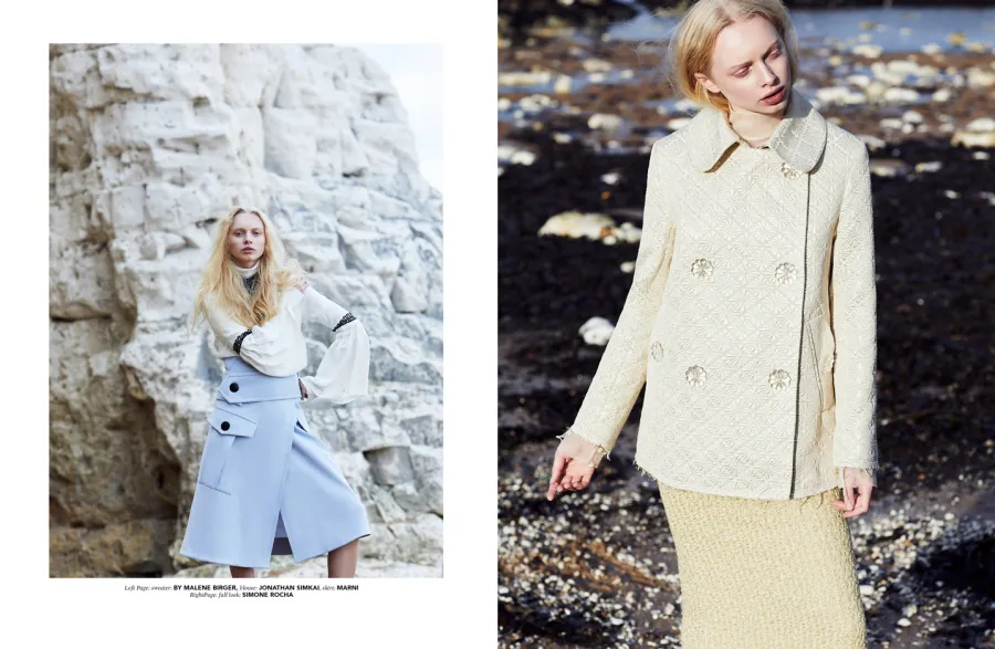 Left Page: sweater: Malene Birger, blouse: Jonathan Simkai, skirt: MARNi